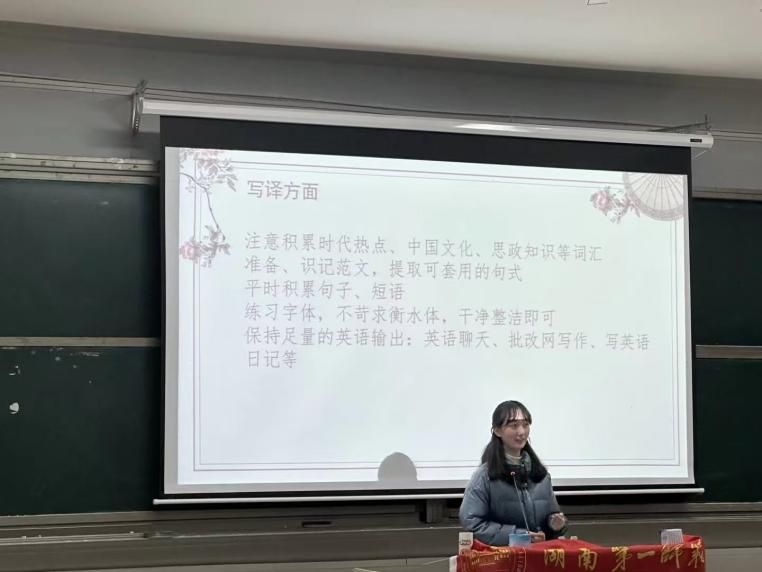吴佳敏同学则从考前准备切入,提醒大家务必提前备齐考试证件与必备物品,珍惜每一次考试机会。在备考策略上,她强调考前刷题的重要性:听力部分应学会划记关键词、预判同类词与推测题意;阅读部分可以通过把握首尾句与关键词实现快速解题;写作方面,她建议通过研读范文、积累高级表达,并在练习中主动运用,逐步形成个人的写作模板。