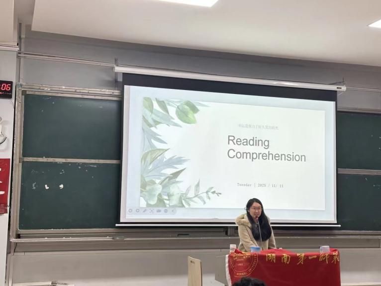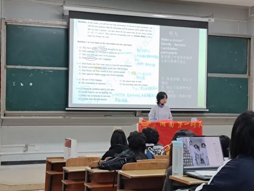 刘妍伶同学首先梳理了四级考试的整体流程,并提出了“浏览、划记、猜测”的“三步走”答题策略。她结合真题演示,重点讲解了听力部分的应试技巧,提醒大家在平时练习中要养成良好的做题习惯,注重对知识的灵活运用。