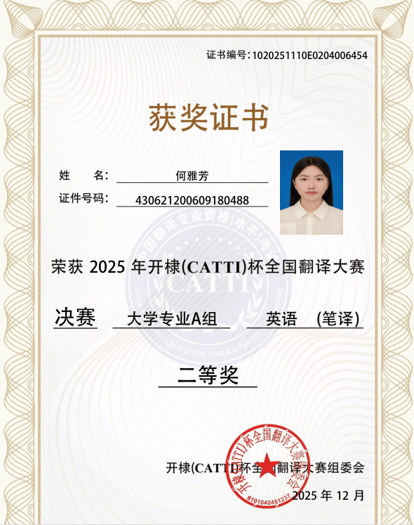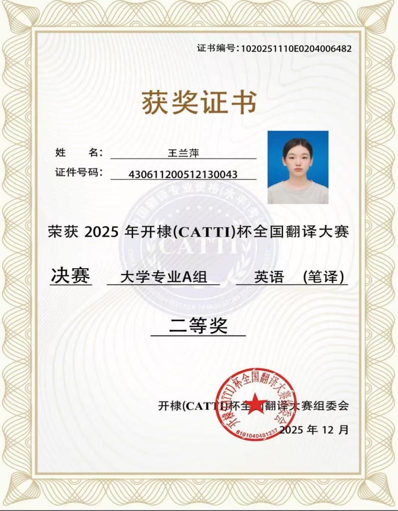 2025年11月,由全国翻译专业学位研究生教育指导委员会和中国外文局翻译院联合主办的2025年“CATTI杯”全国翻译大赛全国总决赛圆满落幕。我校学生在本次比赛中表现优异,取得了一个一等奖,两个二等奖,七个三等奖的好成绩。王梓轩同学获得笔译决赛一等奖,何雅芳、王兰萍获得笔译决赛二等奖,黄月、付嘉超、汤嘉霖、孙浩繁、刘婉莹、杨逸凡、王媚获得笔译决赛三等奖。获奖同学的指导老师是李满红、张丽红、曾昭艳、向红、李爱华等老师。