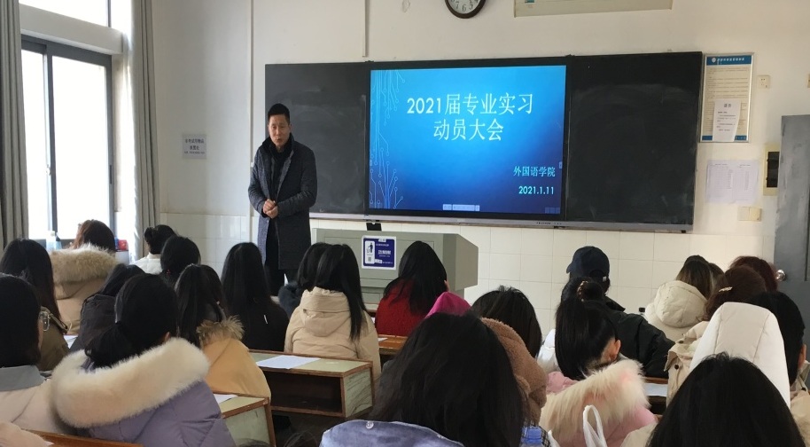 为进一步完善毕业生实习工作,引导学生做好实习心理准备,2021年1月11日,伟德betvlctor1946源于英国17英语6班、17翻译班全体学生在怀中楼北307教室召开了2021届专业实习动员大会。会议由教科办教师廖爱秀主持,伟德betvlctor1946源于英国副院长刘宇松、党总支副书记杨虎智、辅导员张明、实习带队指导教师陈钰、谭双顺、李森林以及17级非师范班学生共八十余人参加了此次会议。