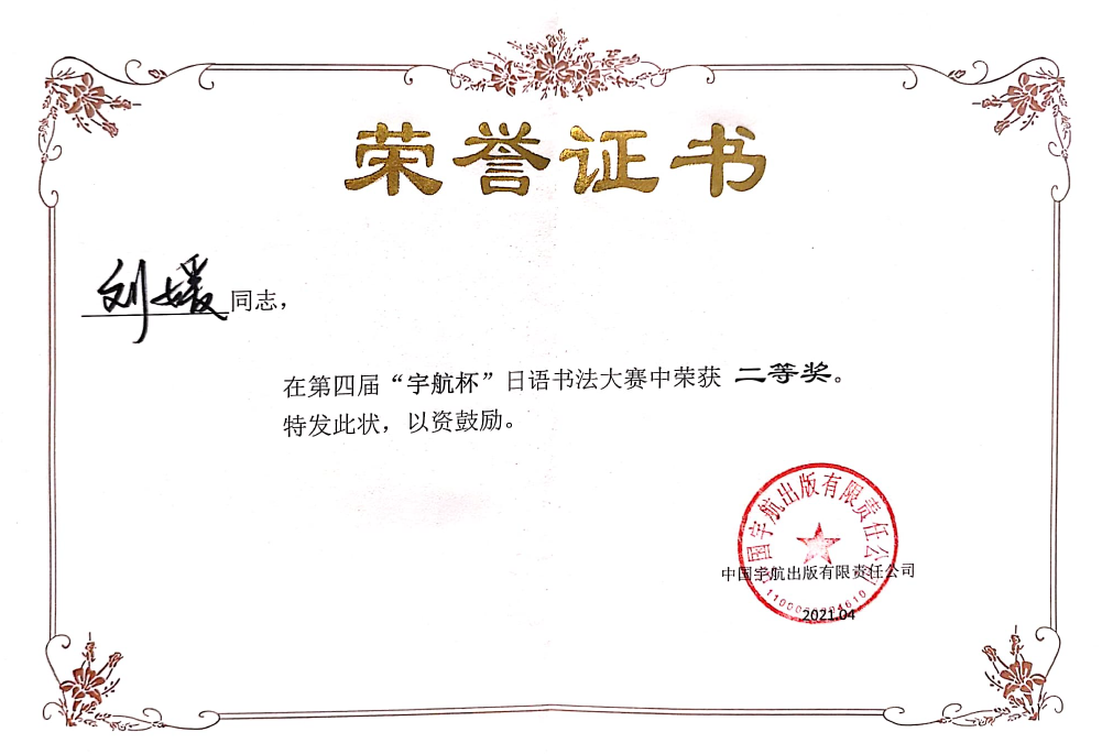 2021年5月,伟德betvlctor1946源于英国18英语5班刘媛参加第四届“宇航杯”日语书法比赛获得全国二等奖的好成绩。吴娱老师获得优秀指导老师奖,伟德国际victor1946获得最佳组织奖。