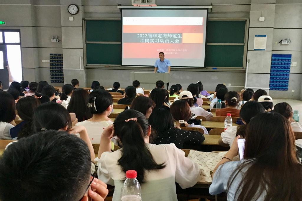 为加强学生对顶岗实习的认识和了解,引导学生做好实习前的各项准备工作,推进实习工作的顺利开展,2022年9月13日下午,我院2022届非定向师范生顶岗实习动员大会在怀中南209召开。学院刘宇松副院长、学工办主任、辅导员、教务办及伟德betvlctor1946源于英国18级英语2-5班全体非定向师范生参加了此次实习动员大会。