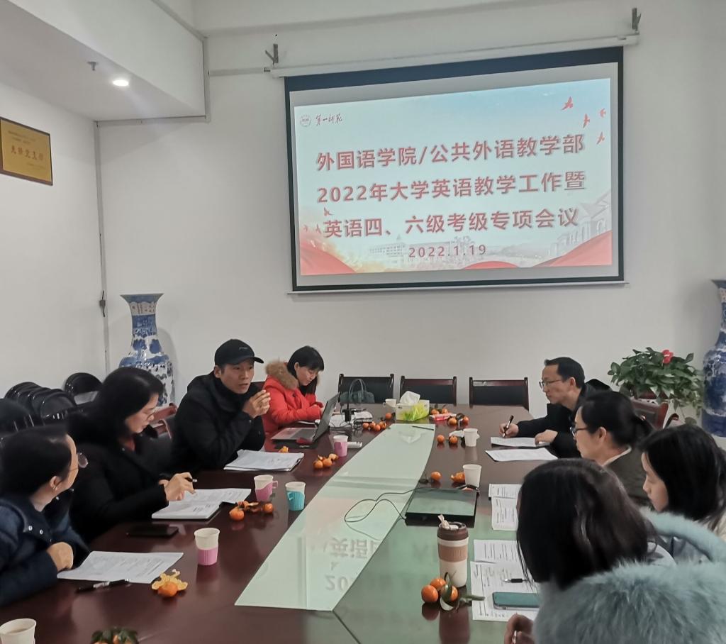 为了提升我校大学英语教学质量,提高学生大学英语四级通过率,确保学校“十四五”规划学院核心指标扎实落地,2022年1月19日上午9:00,我院在百熙楼223会议室召开了2022年大学英语教学及四级专项会议。会议由学院院教学副院长刘宇松主持,公共外语教研一、二室正副主任、考试主管,课程负责人,大学英语课程各备课组长参加会议。