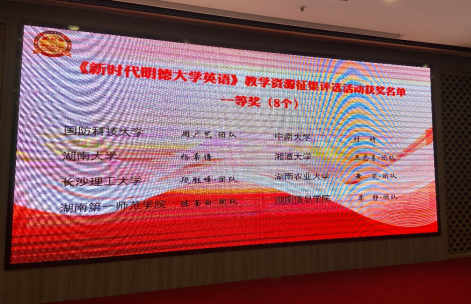 在2022年4月23日召开的湖南省高校外语课程思政高质量建设学术研讨会暨湖南省高校外语课程思政联盟成立大会上,我院《新时代明德大学英语》教学团队在教学资源征集评选活动中荣获省级一等奖。