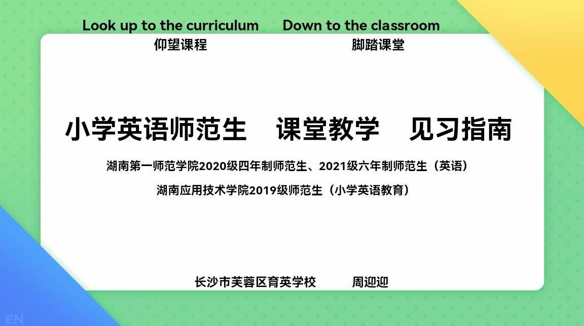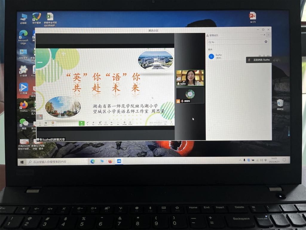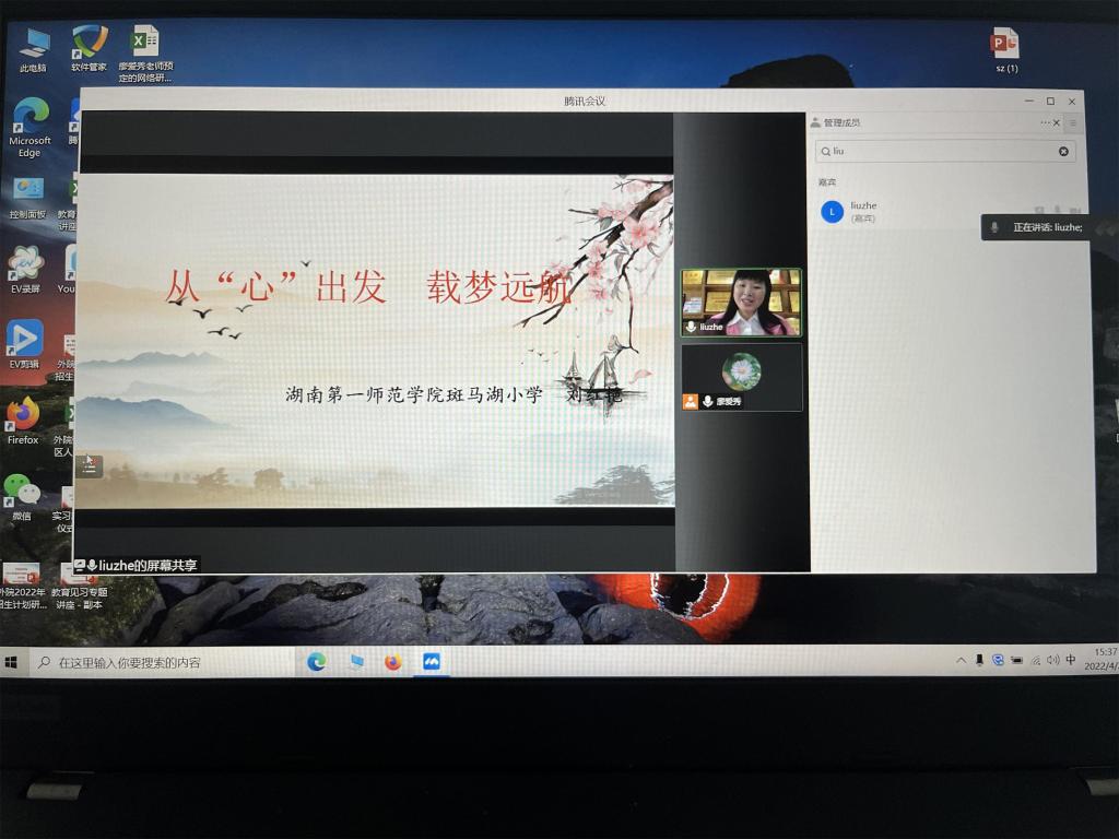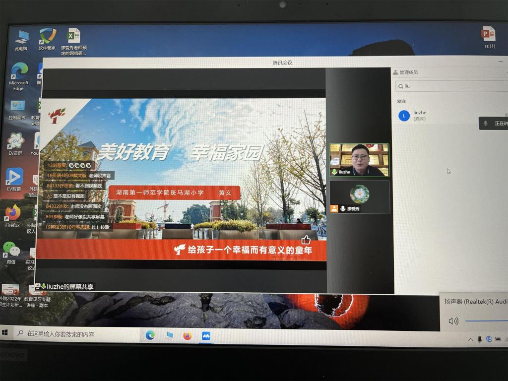 根据省教育厅和长沙市疫情防控的相关要求,本学期教育见习在校内进行。伟德betvlctor1946源于英国刘明东中、小学英语导师工作坊利用工作坊专家资源库邀请一线优秀小学校长、教师利用腾讯会议平台为参加本次见习的学生开展线上讲座。我院21级874-877英语班、20英语1-4班、20级840-843英语班、19英语1-4班全体学生及见习指导教师参加。
