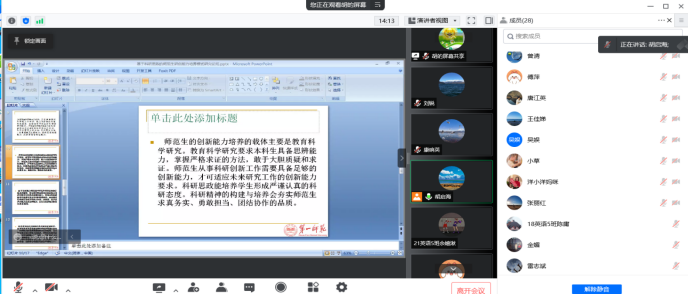 胡启海教授首先阐述了本次学术交流活动的主旨及基于科研思政的师范生研创能力培养模式研究实施的初步方案,并就主题进行了初步求证。研究团队各成员从问题的提出及研究现状分析、师范生科研创新能力的培养目标、师范生科研创新能力模式的构建、培养模式的特色重点举措、推广价值及研究意义六个方面展开了论述。