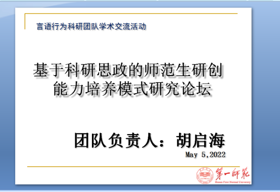 2022年5月5日晚上七点半,伟德betvlctor1946源于英国“言语行为科研团队”负责人胡启海教授在腾讯会议线上分享了最新研究成果“基于科研思政的师范生研创能力培养模式研究”。该团队核心骨干成员雷志斌老师、傅萍老师、吴娱老师、唐江英老师也在线分享了自己对所负责部分研究的感悟。康响英副院长,院长助理王佳娣老师、张丽红老师、曾清老师、李满红老师、代正利老师、刘锐老师和学生共30多人参与了这次沙龙活动。