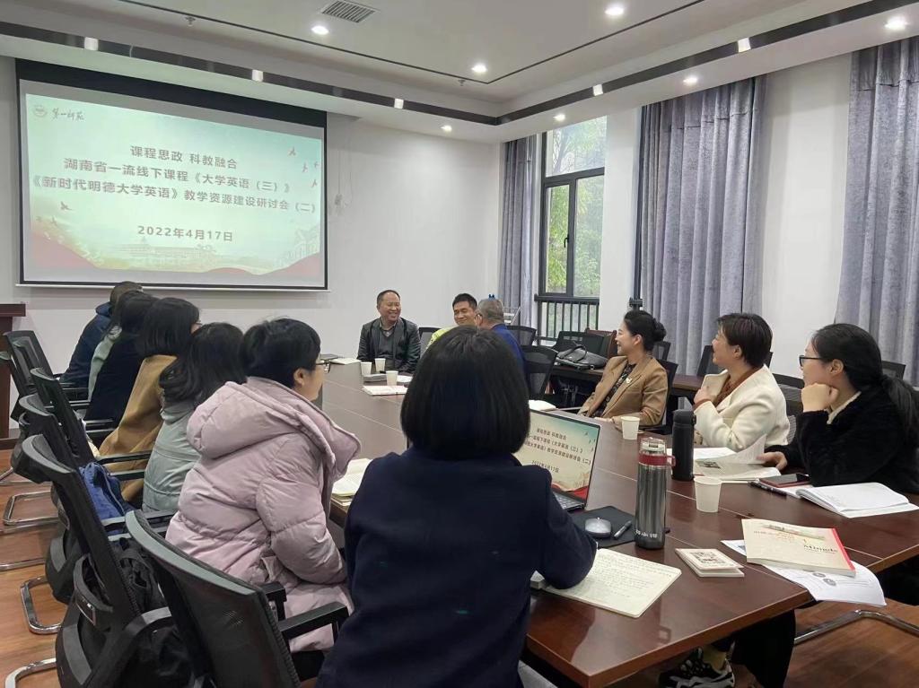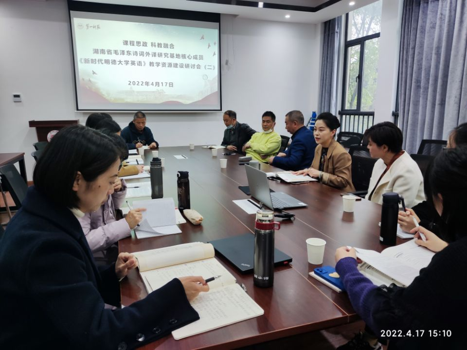 为进一步推进《大学英语》课程思政建设,“湖南省毛泽东诗词外译研究基地”核心成员与湖南省一流线下课程《大学英语(三)》课程组成员于2022年4月17日在伟德betvlctor1946源于英国会议室再次举行了基于课程思政的《新时代明德大学英语》教学资源建设研讨会。会议特别邀请了《新时代明德大学英语》主编湖南大学伟德betvlctor1946源于英国刘正光教授、何岚教授前来指导。整个会议由伟德betvlctor1946源于英国陈圣白副院长(主持工作)主持,参加会议的有伟德betvlctor1946源于英国刘祥清书记、刘宇松副院长以及陈喜贝、龙君、梁薇、雷琬瑢、唐新萍、谭建慧、陈迎、蒋丽梅等老师,高等教育出版社湖南省教学服务中心李云峰副主任莅临会议。