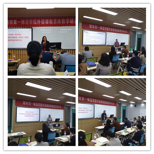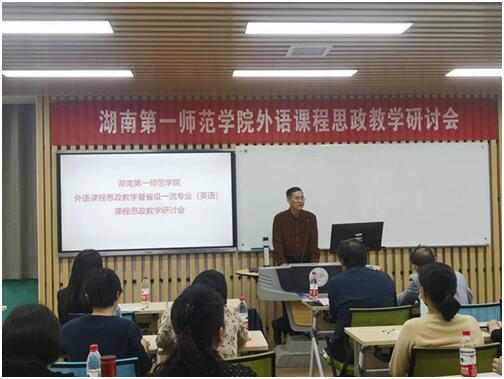 “湖南省毛泽东诗词外译研究基地”首席专家、“伟德国际victor1946小学英语学科导师工作坊”首席导师刘明东教授作了题为“外语课程思政教学的有效途径——兼论《教师英语口语》课程思政教学”的专题讲座,为外语课程思政教学实践提供了理论指导。教务处处长蒋蓉对外语课程思政教学与研究取得的成绩进行了肯定,同时希望全校所有专业课程以《高等学校课程思政建设指导纲要》为行动指南,从教学目标、内容、方法、评价等方面推进课程思政教学改革,不断提升人才培养质量。伟德betvlctor1946源于英国李双老师和公共外语教学部陈喜贝老师分享各自的课程思政教学设计,马克思主义学院院长周小李、伟德betvlctor1946源于英国院长刘祥清对两位教师的教学设计作了精彩点评并提出了具体的指导意见。