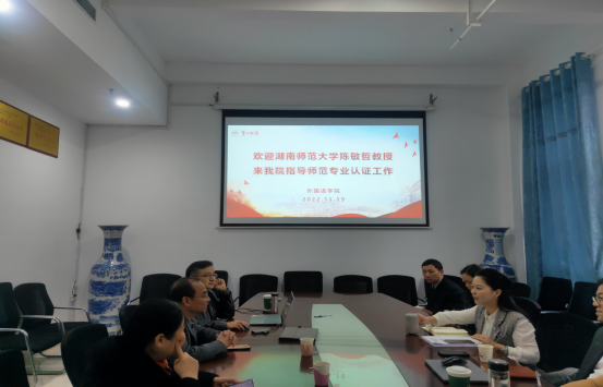 2022年11月19日下午,湖南师范大学陈敏哲教授应邀来我院指导师范类专业认证工作。院党委书记刘祥清,副院长(主持工作)陈圣白,副院长唐文杰、康响英,院党委副书记禹晗,英语系主任张昀霓,以及自评报告撰写组八位老师参会。陈圣白主持会议。