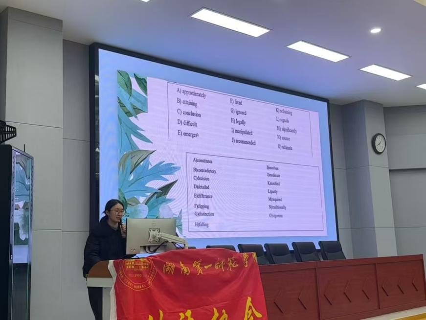 刘妍伶同学首先为大家带来了四级的整体考试流程,并分享了“三步走”的答题技巧——“浏览,划记,猜测”。她以真题实践的方式重点强调了听力部分,提倡同学们在备考过程中需养成良好做题习惯,并注重知识的灵活运用。谢佳慧同学则重点分享了阅读理解的攻略,深入讲解了“词性成分判断法”在阅读理解中的重要性。同时,她还针对日常积累部分提供了词汇积累、信息筛选能力的培养等宝贵建议。刘洁同学为大家带来了写作技巧,重点分析了“现象解释型,问题解决型,观点选择型”议论文。通过讲解翻译真题,她将自身学习过程中所遇到的问题与采用的学习方法倾囊相授,引得同学们的热烈反响。
