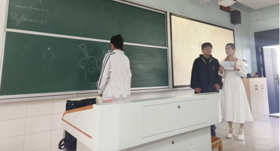 随着主持人的宣布,一场趣味无穷的暖场游戏“你画我猜”拉开了序幕。各学院派出一名代表上台,通过表演或画画的方式描绘出指定的单词,剩余的同学则争相竞猜。这一环节不仅考验了同学们的词汇量与想象力,更在欢声笑语中拉近了彼此的距离。紧接着,主持人邀请了几位同学上台,以哈利波特为主题进行了简短而精彩的分享。同学们用英语流畅地表达了自己的观点与感悟,展现了良好的语言表达能力。