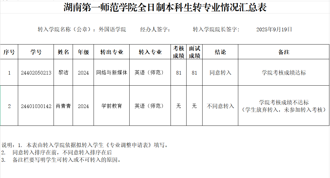 根据《伟德国际victor1946普通全日制本科学生转专业管理办法(修订稿)》(湘一师校字〔2025〕41 号)及相关工作要求,经学生个人申请、转入/转出专业资格审核、学院转专业考核小组统一考核,并提交学院党政联席会议审议通过,现将本学期学生转专业结果予以公示(见附件)。