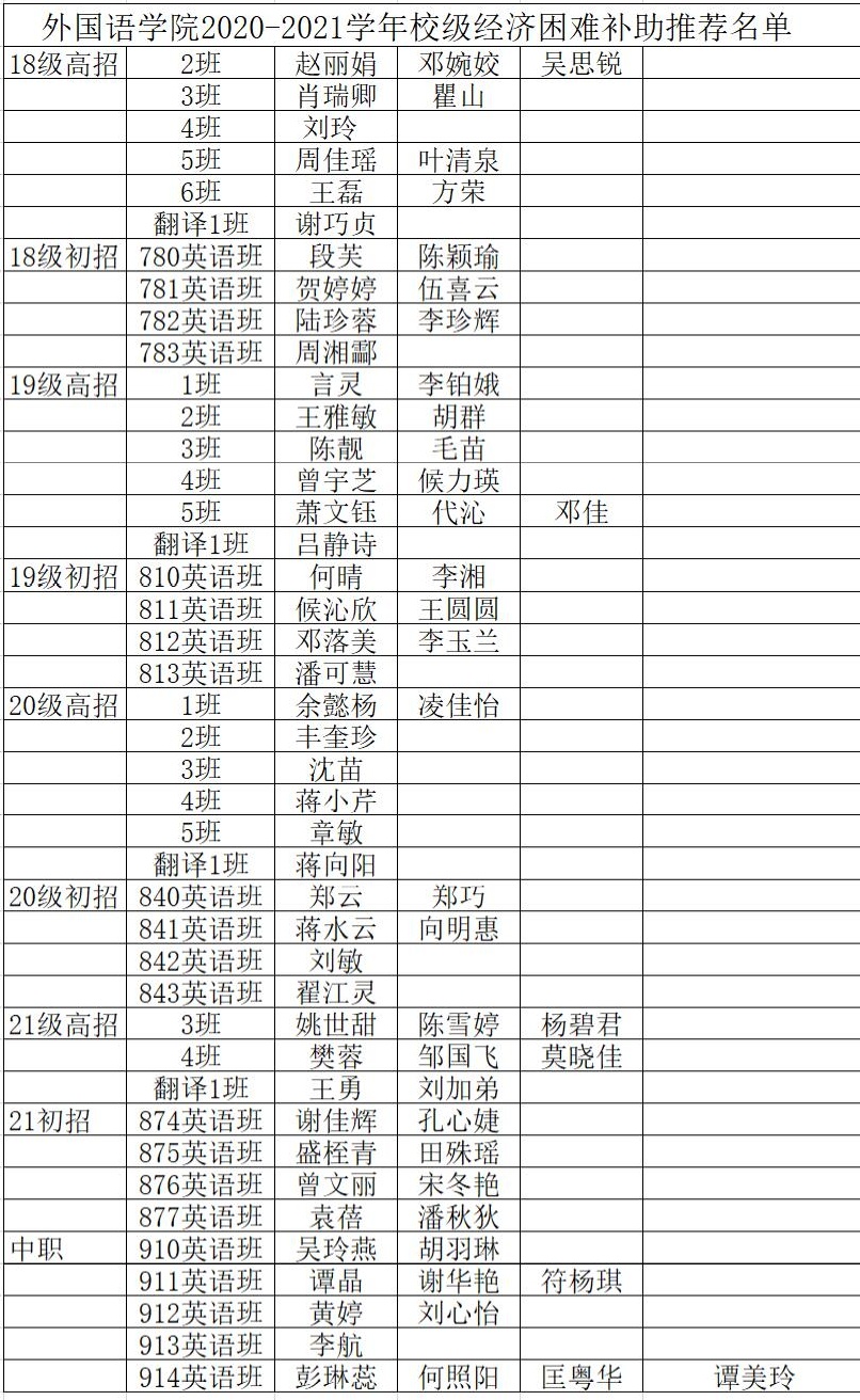 根据学校关于校级经济困难补助的相关要求,经年级评审小组评定、辅导员审核、学院党政联席会研究,我院校级经济困难补助推荐名单已经产生,现公示如下,如有异议,请于公示之日起5个工作日内到院学工办实名反映(电话:82841078)。若无异议,公示期后评审结果自动生效。