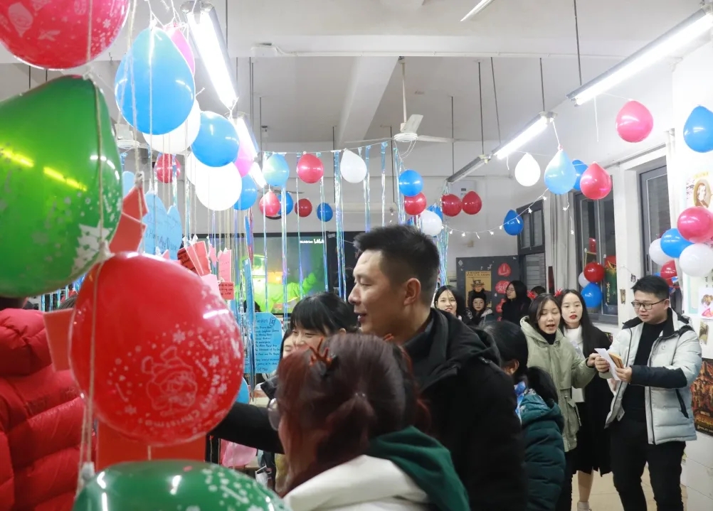 活动现场,外院学生们用气球、彩带等精美的饰品对教室和走廊进行装饰,设置了留言区、投票区、展馆简介区,张贴了各类优秀的美术、书法作品,播放各种优质影片和音乐,开展了“红色知识答题”、“你画我猜”、“猜灯谜”、“飞花令”、“奥运冰球小游戏”“歌唱角”等一系列趣味性十足,各具特点、形式多样的游戏活动,引得参与游园会的师生纷纷驻足围观,现场人头攒动、热闹非凡。
