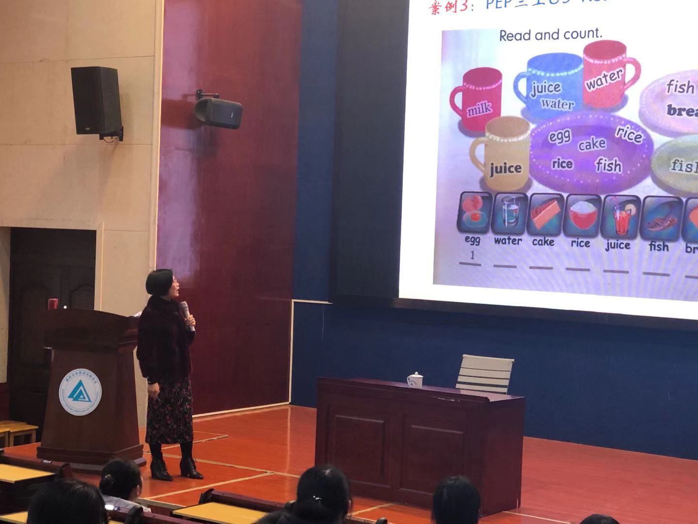 孙老师讲座从“一线教师之问”入手,即:为什么我从教材中挖掘不出新东西或真东西?怎样解读教材文本才能最大限度捕捉到真东西?怎样处理教材中那些看上去“食之无味,弃之可惜”的活动?怎样创设情境,有效开展教学活动?接着,孙老师以英语学科核心素养理念为指导,针对小学英语课堂中存在的具有普遍性和代表性的问题,结合典型案例,直观、生动、形象地阐述了如何解读小学英语教材中的“话”与“画”,以挖掘教材中的“真东西”和“新东西”。随后,再通过视频案例,具象化呈现了如何创设情境,进行有效教学的方法。所选择案例针对性强,一线教师听得懂、有启发、做得来。最后,孙老师分享了自己曾与一线教师合作进行绘本阅读教学实证研究的成果,向现场老师们真实再现了如何通过把主教材与英语绘本融合落实核心素养的实施方法、过程与实验效果。
