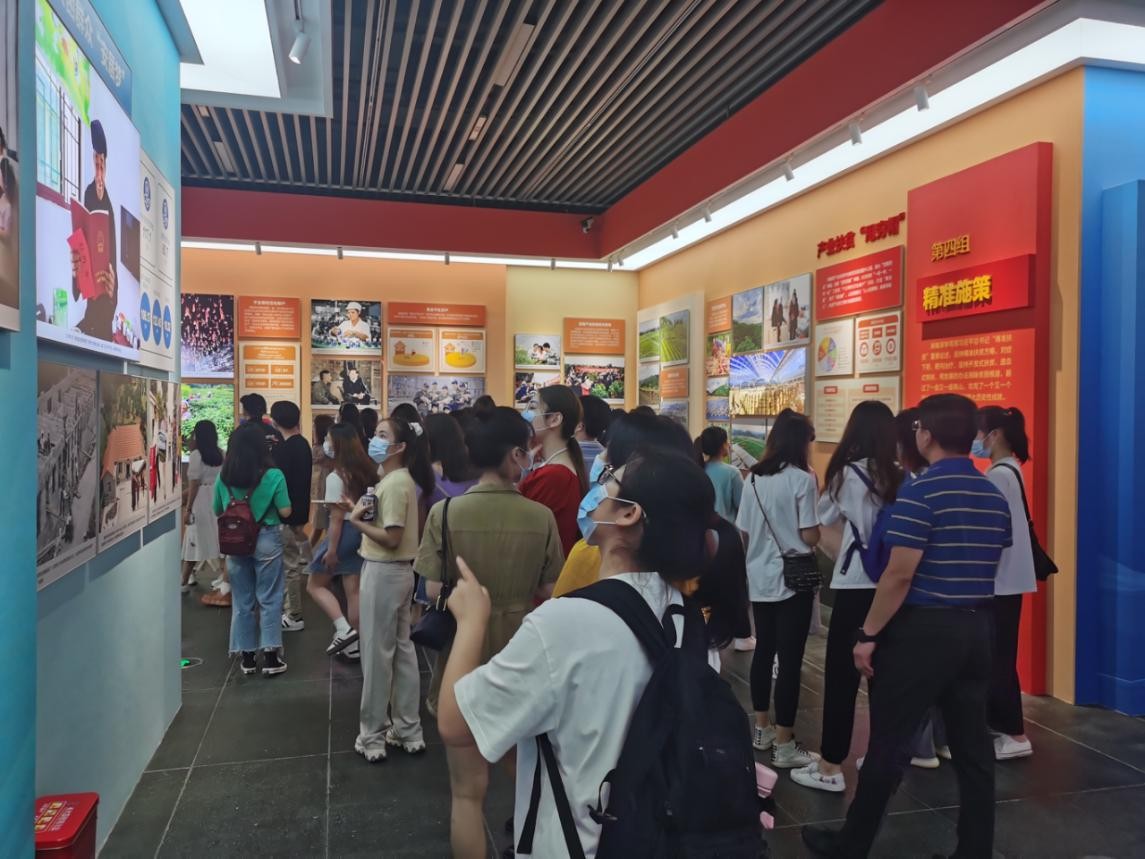 在讲解员的带领下,同学们依次参观了“历史伟业”“首倡之为”“磅礴力量”“希望田野”四个篇章。在“历史伟业”篇章,同学们深入了解了党的十八大以来精准扶贫的重大决策部署;在“首倡之为”篇章,大家深刻感受了湖南作为精准扶贫首倡之地的首创之为;在“磅礴力量”篇章,同学们认真聆听湖南党员干部、社会各界和人民群众在脱贫攻坚战中的典型事迹和感人故事;在“希望田野”篇章,一张张灿烂的笑脸,让同学们深切地感受到了广大脱贫群众的幸福和对党的感恩。