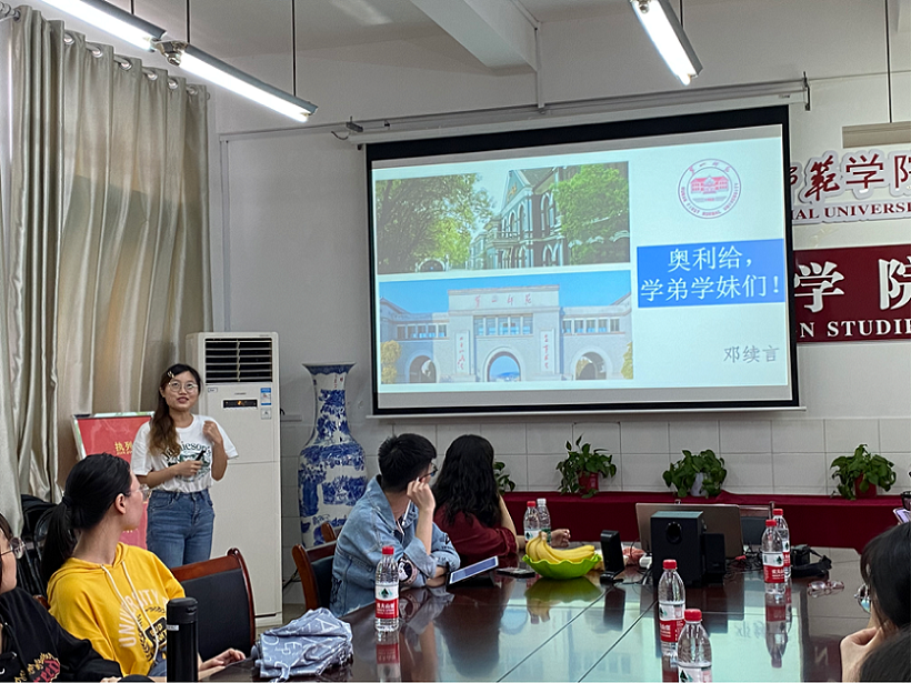 上海师范大学毕业硕士毕业的14级外院学子邓续言与大家分享了上海的学习和工作经历。她说,英语专业学习,除了提升听说读写译技能之外,还需广泛涉猎课外读物,培养不同的兴趣,可以通过网络平台如youtube、Facebook、TED、B站、MOOC、网易公开课、喜马拉雅等各种网络资源,观看各类纪录片、好剧好电影、音乐等,拓宽自己的视野。她结合自己学习和工作经历,认为成长路上下面几点至关重要:1)提高自身专业能力,明确自我定位,专注自我提升,实现自我价值;2)善于向师长和优秀人士学习,多思考,多计划,多行动;3)提高自己的财商和团队合作能力。