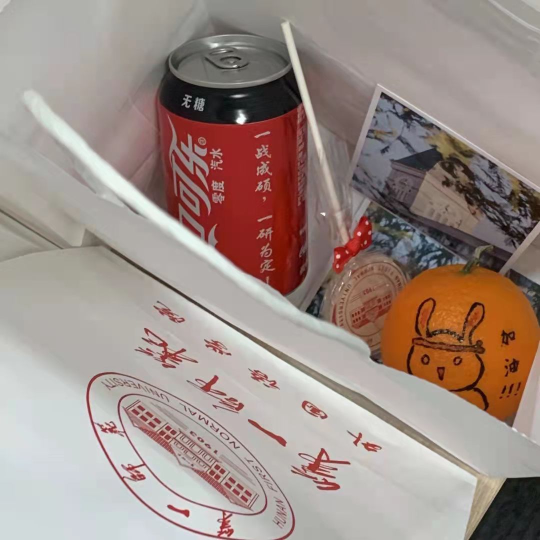 除师生的“声援”外,我院还贴心地为每一位考研学子准备了“考研慰问大礼包”:印有一师logo的棒棒糖寓意着先苦后甜;被亲手绘上可爱表情的橙子表达了对考研学长学姐们“橙“功上岸的祝愿;为每个人专属定制上名字与祝福的可乐意味着”万事可乐“,希望学长学姐们以积极乐观的心态迎接考试;印绘着一师美丽景色的明信片也提醒着大家一师外院是他们永远的家园。