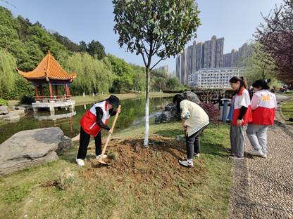 紧接着,在辅导员老师和负责人的带领下,所有志愿者们均到达了指定位置。随机分组后,志愿者们两两搭档,一人挖坑,一人栽种,同劳动齐协作,挥锹培土、扶苗浇水、填土压实,道道工序细致认真、有条不紊。活动现场一片热火朝天的景象,成为了校园里一道靓丽的风景线。在活动过程中,党员志愿者们脸上不时流下的汗水同他们的喜悦一起融入了泥土,共同孕育着希望的树苗。
