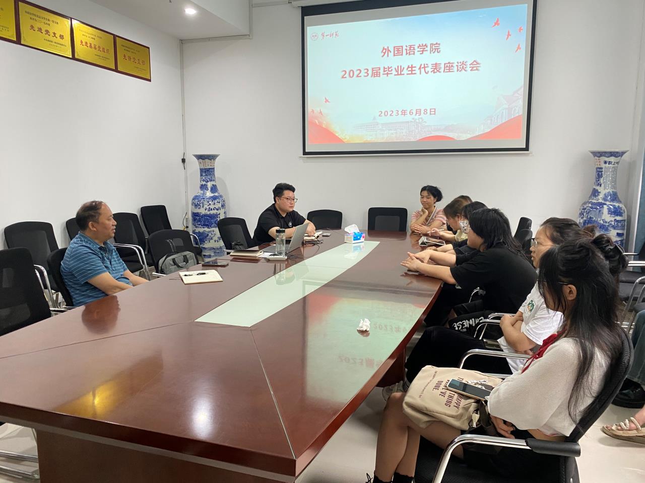 6月8日上午,我院在百熙楼学院会议室223召开2023届毕业生代表座谈会。学院党委书记刘祥清、副院长(主持工作)陈圣白、党委副书记戴建宇、副院长康响英和唐文杰出席会议,教师代表及各班级毕业生代表参加了此次会议。会议由学院党委副书记戴建宇主持。