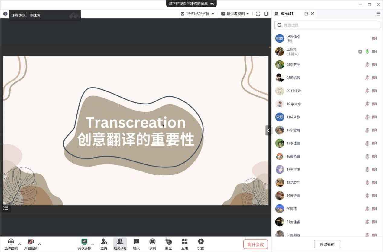 我院于10月18日晚19:00-20:30在怀中北306教室举办了“Transcreation:创意翻译的重要性”专题讲座。本次讲座的主讲人为王姝玮老师,我院23英语润之英才班全体学生参与了此次讲座。