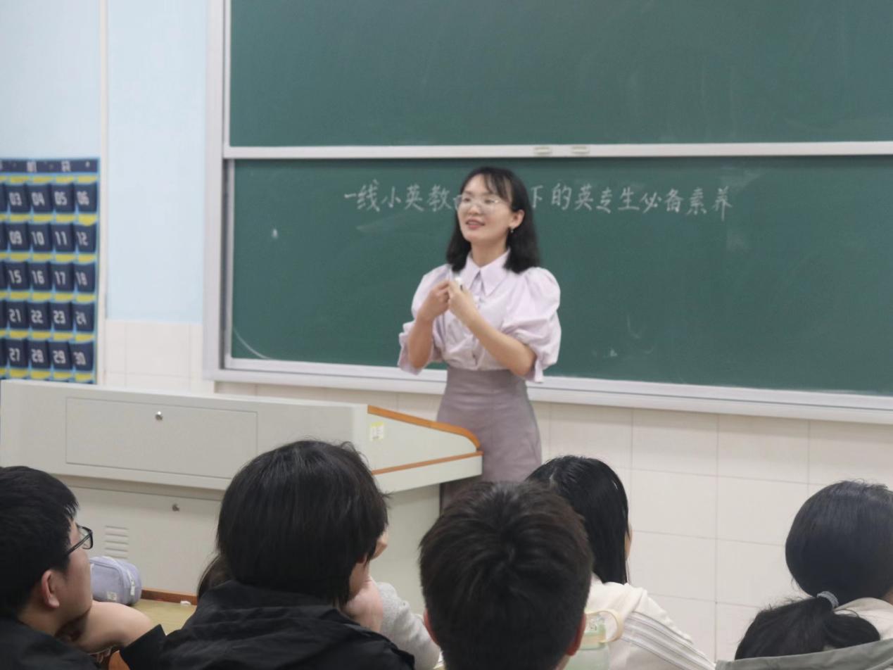 刘咪从个人简历、考研考编、日常教学和教学竞赛四个方面诠释了英语教师的必备素养。刘咪指出,本科生应提前做好四年发展规划以明确发展方向,在校期间应积极参加实践活动、学科竞赛、证书考试以丰富个人简历。刘咪强调,当代英语教师不仅需具备扎实的专业知识还需有创新教学、整合资源、延伸课堂、跨学科教学的能力。最后,聚焦必备素养,刘咪为同学们大学四年的学习提出了详细建议。