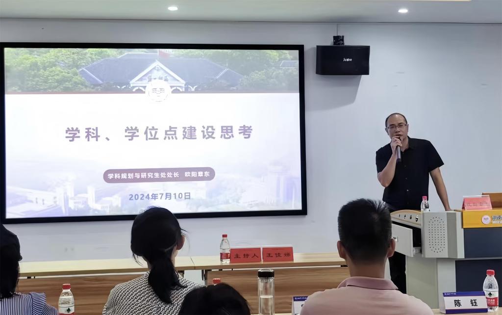 学科规划与研究生处处长欧阳章东教授就“学科、学位点建设思考”进行了专题讲座。他阐释了学科、专业、学位点的含义,分析了学科与专业、学科与学位点的关系,解读了国家学位授权审核政策,重点分析了我校学科专业的现状,指出伟德betvlctor1946源于英国在硕士点学位申报准备过程中面临的机遇与挑战,并从学院和教师层面提出了具体建议。