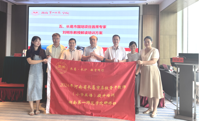 8月16日上午,由我院承办的河南省长葛市县级骨干教师(小学英语)提升培训研修班在梅溪湖豪生酒店举行了隆重的开班仪式。学院党委书记何培森、长葛市教体局袁新友副局长、长葛市教体局师训股李政浩主任、项目首席专家刘明东教授、副院长王佳娣以及项目班主任等相关人员参加了开班仪式。开班仪式由项目班主任刘洁文老师主持。