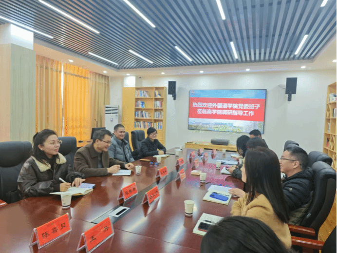 为推进学院学科专业建设,贯彻落实学校本科教育大会精神,在《两优方案》下谋求新发展,1月13日上午,学院党委书记何培森带领外院领导班子成员到商学院学习交流。商学院党委书记邓剑、院长王朝晖、其他院领导及综合办主任参加了交流会。