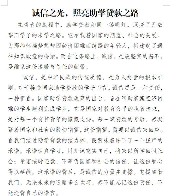 征文比赛同样精彩纷呈,众多优秀作品脱颖而出。其中,《诚信之光,照亮助学贷款之路》一文以形象比喻,将助学贷款喻为“照亮求学路的明灯”,深刻阐述诚信还贷是对国家关爱的最好回应;《手心的温度》则以作者自身家庭故事及兼职攒钱经历为视角,细腻展现诚信与感恩之情的交融,引发广泛共鸣。