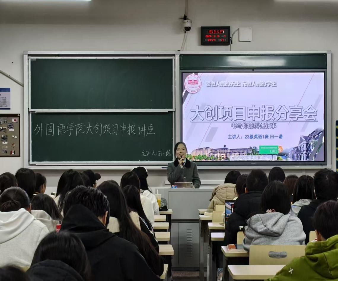 为帮助大一学生明晰大学生创新创业训练计划(简称 “大创”)申报流程,提升科研创新能力,11 月 13 日晚,伟德betvlctor1946源于英国在图书馆 203 教室成功举办大创项目申报分享会。2023 级英语 1 班田一诺同学担任主讲,100 余名大一学生到场聆听学习。
