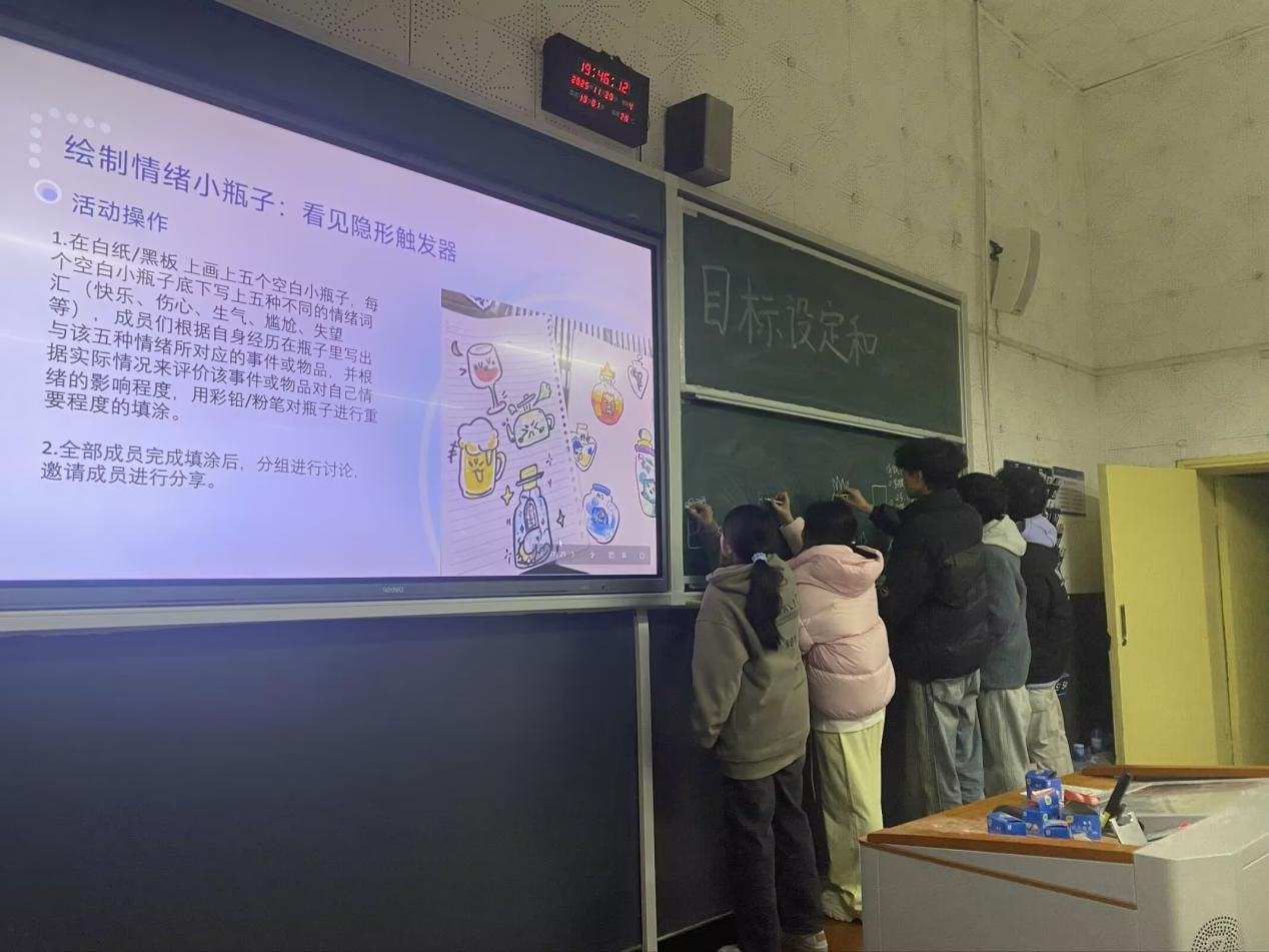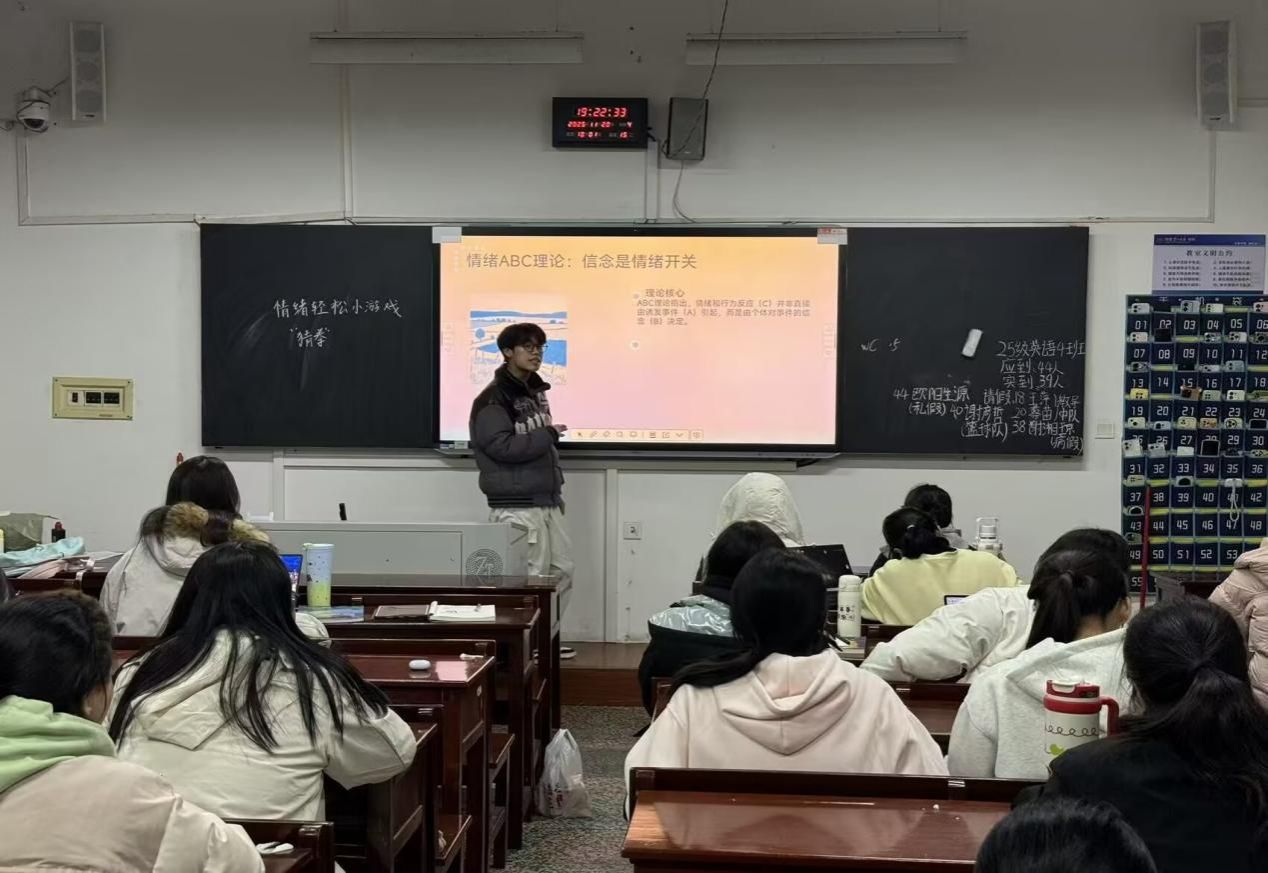 活动现场氛围轻松融洽,通过“进化论”融冰游戏、情绪 ABC 理论讲解、“快乐清单”分享、情绪小瓶子绘制等多个环节,引导同学们在互动中释放压力,在交流中深化对情绪的认知。大家积极参与各项环节,主动分享自身情绪体验与调节心得,在彼此的倾听与鼓励中学会了换角度看待情绪问题,掌握了放松、转移、宣泄等实用情绪调节方法。