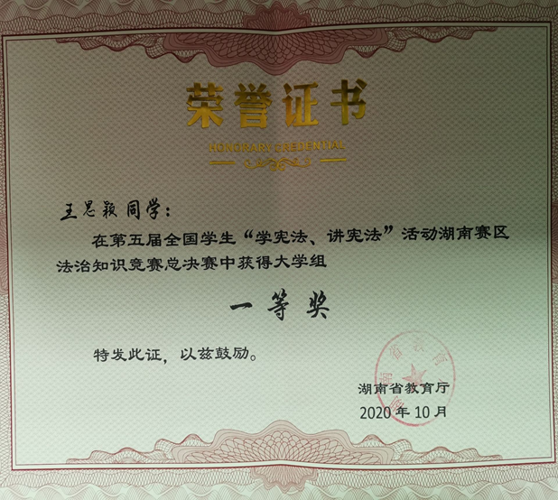此次“学宪法讲宪法”活动比赛共有初赛和决赛两个环节。我院王思颖同学在马克思主义学院肖霄老师的指导下认真学习宪法知识,完成好每一道学习题库中的题目,经过半个月的反复练习和老师的要点指导,王思颖同学最终获得第五届全国学生“学宪法讲宪法”活动湖南赛区法制知识竞赛总决赛大学组一等奖的好成绩。