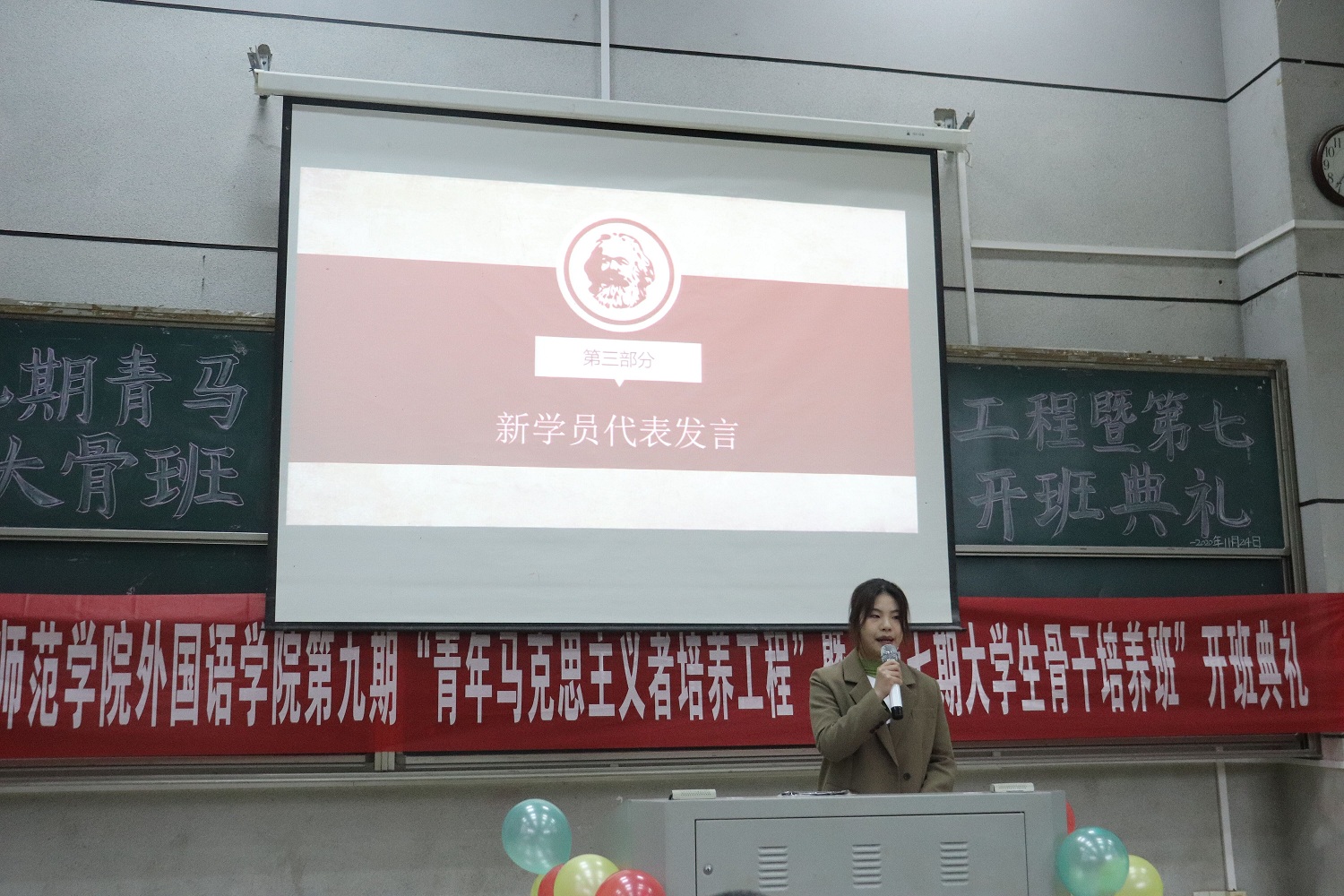 2020年11月24号,伟德betvlctor1946源于英国在怀中南110教室举行了以“青春勇担当,服务新时代”为主题的第九期“青年马克思主义培养工程”暨“第七期大学生骨干培养班”开班典礼。活动旨在加强我院学生干部队伍建设,提高我院学生干部的理论水平、战略思维、领导能力和党性修养;同时在学生群体的思想引领工作与文化教育工作上,培养他们树立自己的人生理想,面对阻碍迎难而上,勇于担当的精神品质。参加此次培训人员共175人,党总支书记李亚林、党总支副书记杨虎智、团总支书记张明、学工办主任陈阳老师以及全体辅导员受邀出席典礼。