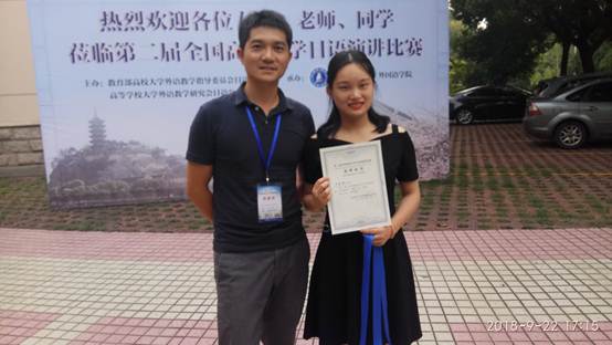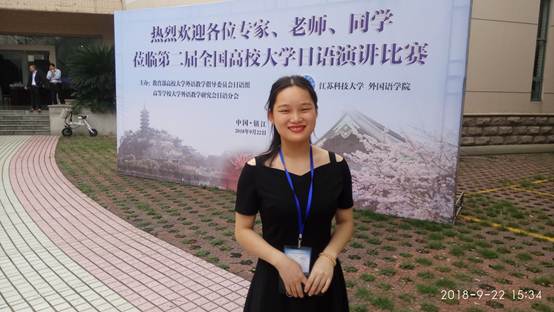 时值金风送爽的中秋佳节,我院刘锐老师指导的15级688班郑紫君同学为学院献上了一份礼物!9月22日,由教育部高校大学外语教学指导委员会暨高等学校大学外语教学研究会日语分会主办的“第二届全国高校大学日语演讲比赛”在江苏科技大学举行。来自全国33所高校的选手参加了此次比赛。经过激烈角逐,我院郑紫君同学荣获二等奖,为学校争得了荣誉。