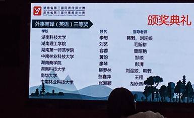 2018年11月24日,由湖南省人民政府外事侨务办公室主办,中南林业科技大学承办的湖南省第三届同声传译大赛和外事笔译大赛在中南林业科技大学举行。共有21所省内本科院校、250多位本科生及研究生参赛。我校伟德betvlctor1946源于英国容蓉等8名同学参加了此次大赛,与来自中南大学等一本院校的研究生同台竞技。经过一天的激烈角逐,我院学生取得了良好的成绩,由曾昭艳老师指导的15英语1班容蓉同学获外事笔译(英语)大赛三等奖。