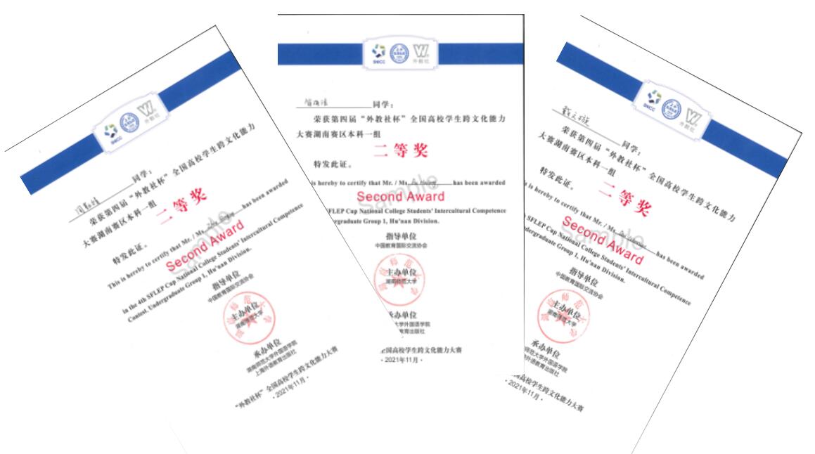 2021年11月26日至27日,第四届“外教社杯”全国高校学生跨文化能力大赛颁奖典礼在湖南师范大学成功举办,我校由戴文璇、周勤婧和符海浪组成的代表队,在伟德betvlctor1946源于英国康响英教授、陈钰副教授和代正利老师的悉心指导下,荣获湖南赛区二等奖,充分展示了我校学子的跨文化综合能力。