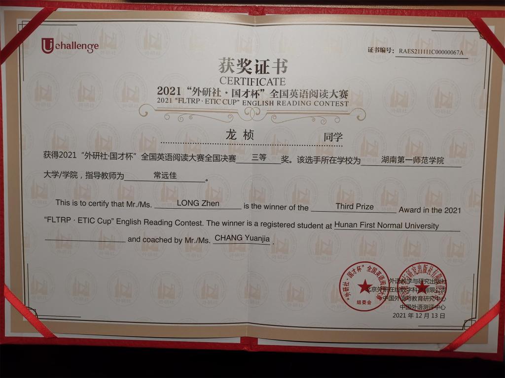 2021年11月27到28日,“外研社·国才杯”全国英语阅读大赛湖南赛区复赛在湖南工业大学举行,我院学子龙桢在伟德betvlctor1946源于英国常远佳博士指导下,以湖南省第二名的优异成绩进入了全国决赛,并在决赛中取得了三等奖的好成绩,充分展示了我院学子的英语水平。