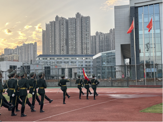 国旗护卫队迈着铿锵有力的步伐护送鲜艳的五星红旗入场,伴随着庄严的《义勇军进行曲》,五星红旗冉冉升起,全体师生以崇高的敬意向国旗行注目礼。