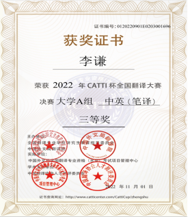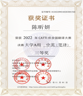 2022年CATTI杯全国翻译大赛于2022年5月至9月举办。10月31日,决赛成绩揭晓,我院英语专业(师范)20英语4班陈昕妍、20英语3班李谦获中英笔译大学A组全国决赛三等奖。