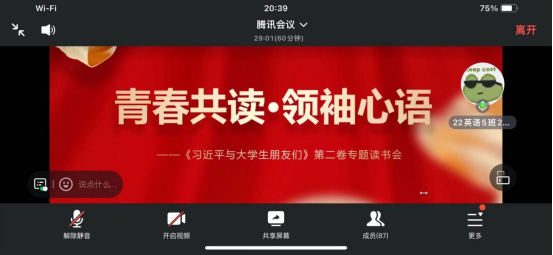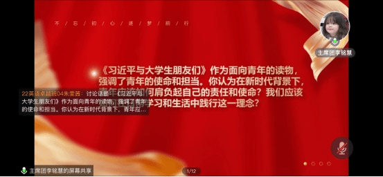 为深入学习贯彻党的二十大精神,推动习近平新时代中国特色社会主义思想的青年化阐释与传播,引导广大青年树立正确的世界观、人生观、价值观,我院于2024年7月28日举行“青春共读•领袖心语——《习近平与大学生朋友们》第二卷专题读书会”活动。本次活动采取线上形式开展,2022、2023级班干部参加,学生会主席团成员李铭慧主持。