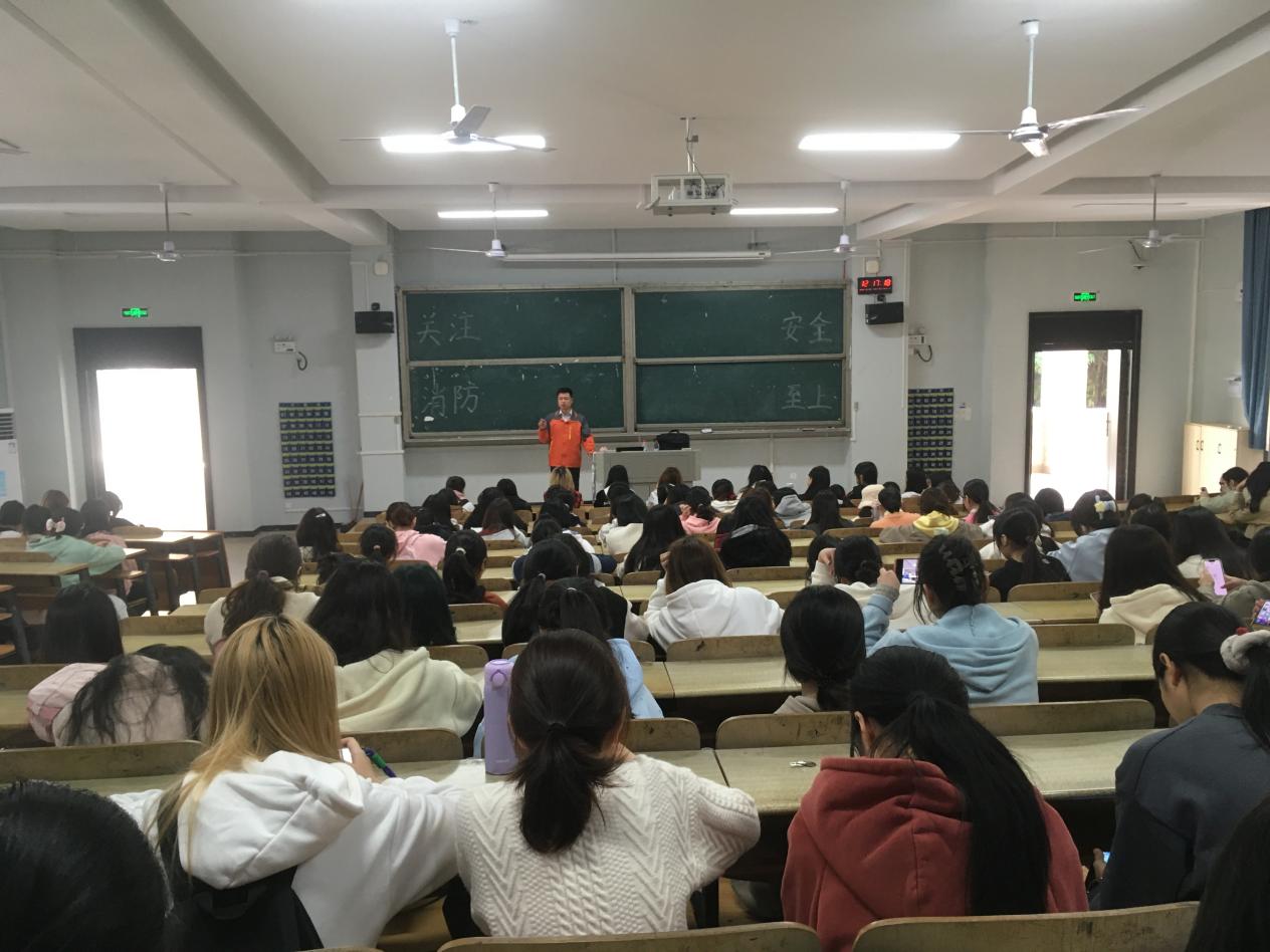 本次活动第一阶段在怀中南108开展了消防安全知识专题讲座。讲座特邀消防队的唐教官作为主讲嘉宾,学院200名同学积极参与。唐教官从学生身边的具体案例入手,再引出消防相关知识,娓娓道来。他先讲述最近发生的几起火灾案例,然后再具体讲解了如果在学校内发现火灾情况,告诉同学们应摁下附近红色按钮、并呼叫保卫科,而不是直接用手机拨打119的具体操作方法。接着他通过提问来讲解高层建筑应如何逃生,并总结出“小火楼梯往下走,大火关门等救援”的口诀。他还讲述了干粉灭火器和二氧化碳灭火器的使用方法和注意事项。最后唐教官告诫大家,现在全国每年大约有100万起火灾事故,绝大多数是家庭火灾,希望同学们可以在生活中灵活运用讲座讲解的知识,避免火灾发生。