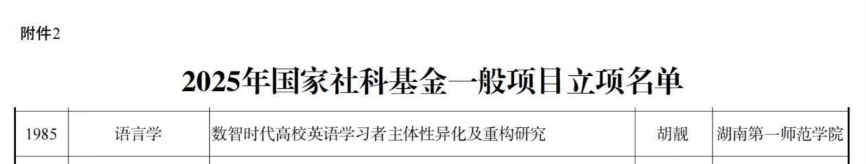9月5日,全国哲学社会科学工作办公室正式公布2025年度国家社会科学基金年度项目立项名单,我院胡靓博士主持申报的课题《数智时代高校英语学习者主体性异化及重构研究》荣获立项,该成果反映了我院教师在语言学前沿领域的学术敏锐性与创新力,也彰显了学院有组织科研体系建设与高水平学科发展的显著成效。