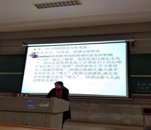讲座开始,康教授直奔主题,提出选择课题应该具有问题意识。康教授通过向同学们展示一些语法错误所闹出的笑话而进入主题——为什么学生虽然懂得语法规则却往往在口语上出错?随后康教授围绕儿童二语习得理论,阐述了“学得”和“习得”的差异,并强调教师应该最大限度地为学生创造习得环境。康教授运用专业知识向同学们介绍了克拉申的“输入理论”、中间语、沉默期、迁移、关键期等知识。同学们聚精会神地聆听并认真做好笔记。接着,康教授列出一些往年学生立项课题,并提出一些热点趋势供大家选题时参考。最后提问环节,康教授与同学们在如何选题、查找资料,撰写申报书等方面进行了互动,讲座在同学们的热烈掌声中结束。