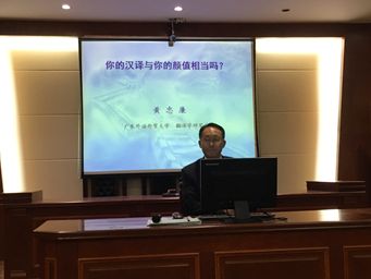 20日下午,在伟德betvlctor1946源于英国会议室,黄忠廉教授以“外文研究系列选题的艺术”为题,展开了一场面向教师的讲座。他以湖北恩施民歌《六口茶》的文字版和声像版的对比为例,引出了翻译中的“生命气息”的主题,继而对翻译中的语气转换、汉译语气助词的缀补、削减进行了举例探讨,最后指出可持续的研究选题。黄教授结合他个人研究选题的经验,传授了外文研究系列选题的方法和艺术。