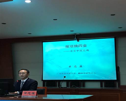 10月18日上午,在科技楼B栋110,应伟德betvlctor1946源于英国“乐之论坛”邀请,黄忠廉教授来我院讲学。讲座题目为:报项摘四金----项目申报之魂。讲座由我院副院长康响英教授主持,院长刘祥清教授做了精彩总结。我校2018年有意申报国家项目的教师及部分青年教师聆听了本次讲座。