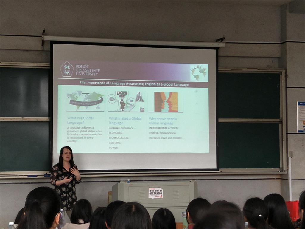 2017年4月13日下午,格罗斯泰斯特主教大学博士AMI MONTGOMERY在文科楼B栋209为我院学生讲学。讲座题目为Teaching English as a Globle Language。 讲座由伟德betvlctor1946源于英国副院长康响英教授主持,国际交流处何晓斓副处长与学院部分师生聆听了本次讲座。