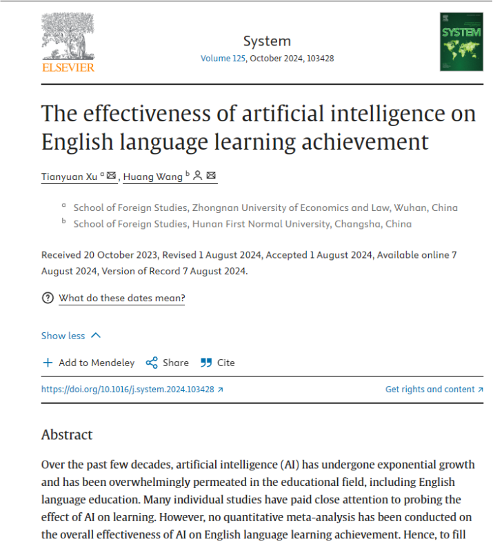 我院王璜博士近日语言学领域权威SSCI期刊System上作为通讯作者发表了一项关于人工智能(AI)在英语学习中效果的元分析研究。该研究汇总分析了来自十余个国家的3290名参与者的40项实证研究,结果表明AI对英语学习成就具有显著的积极影响。