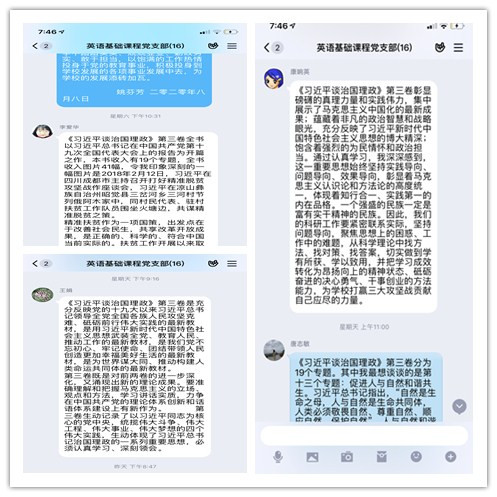 8月上旬,时值酷暑,英语基础课程教研室党支部放假不停学,组织党员对标中央以及省委关于学好用好习近平谈治国理政第三卷的精神,通过线下自学、观看《学习强国》、线上讨论的方式,畅谈了对于《习近平谈治国理政》第三卷的学习认识。
